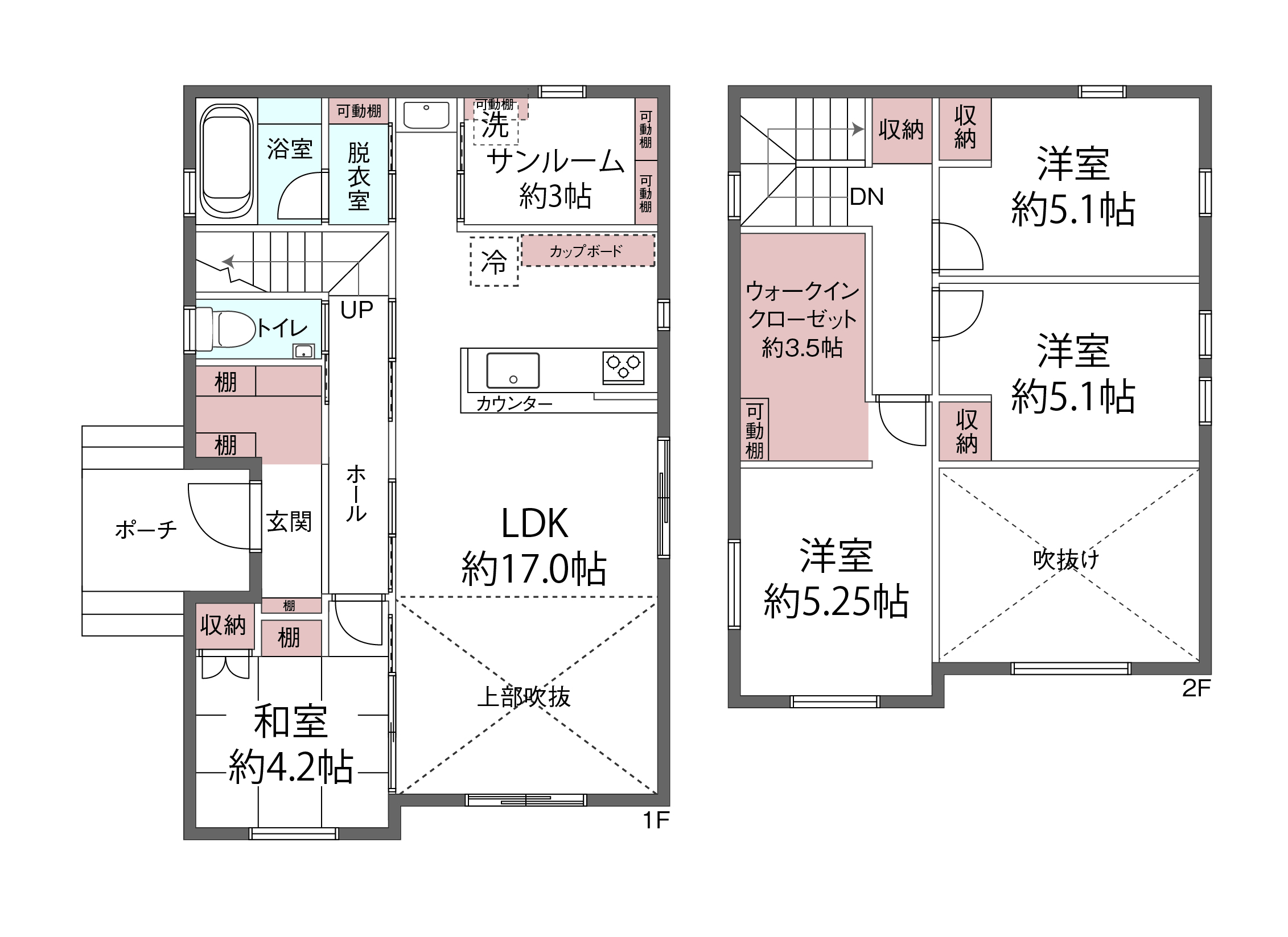 1階:LDK17.0帖、和室4.2帖、サンルーム3帖、浴室、洗面、脱衣室、トイレ/2階:洋室5.25帖、洋室5.1帖、洋室5.1帖、WIC3.5帖