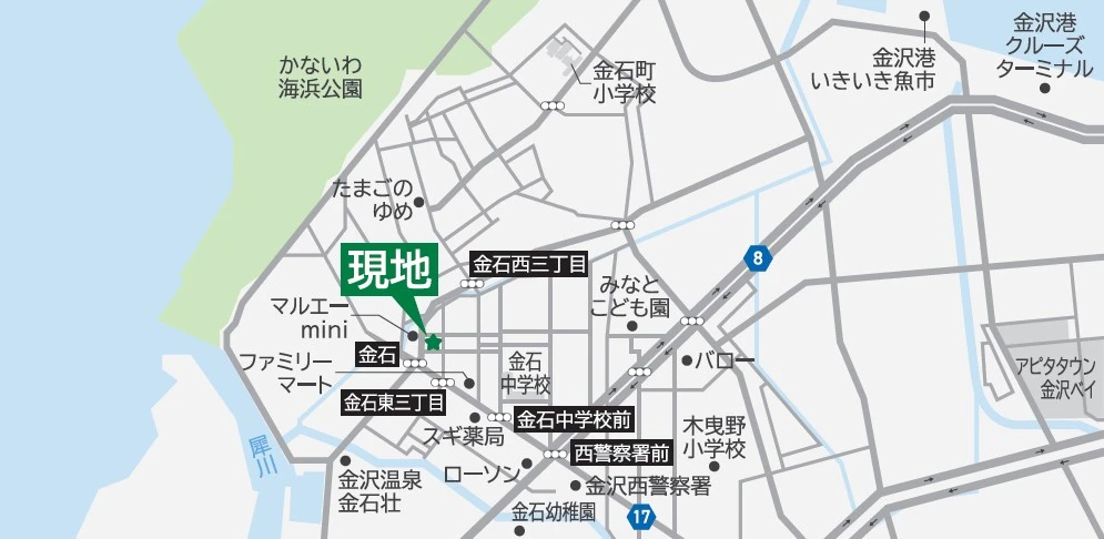 まちなかにアクセスしやすく、金石町小学校まで徒歩18分、金石中学校まで徒歩5分とお子様の通学が安心して見守れるエリアです。