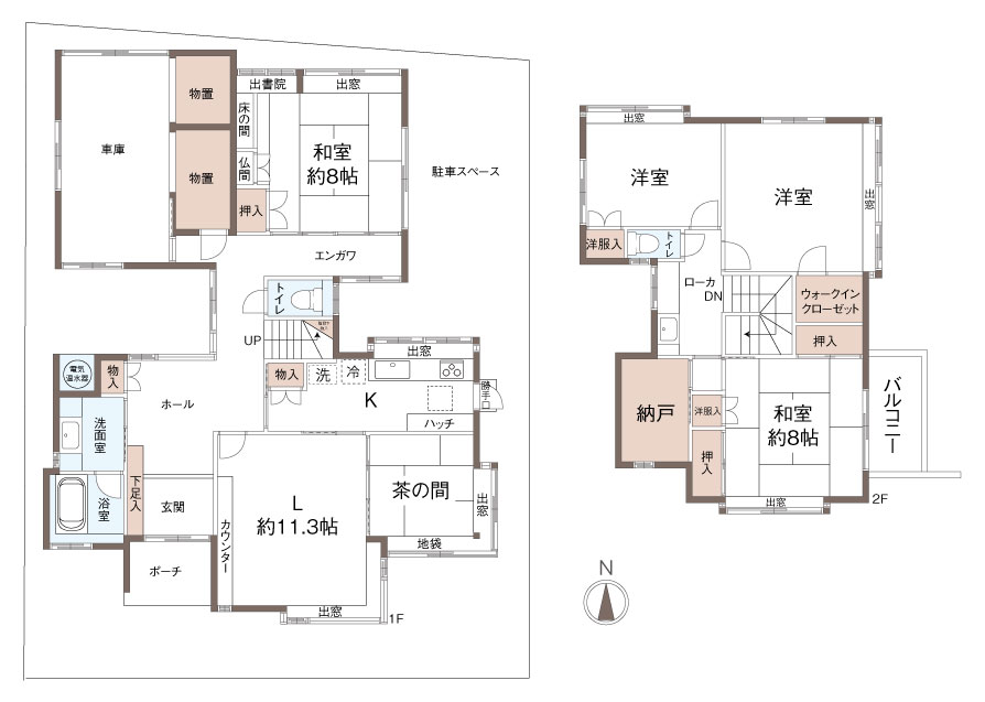 1階:キッチン、リビング、茶の間、和8、洗、浴、WC、物置、車庫 2階:和8、洋、洋、WIC、納戸